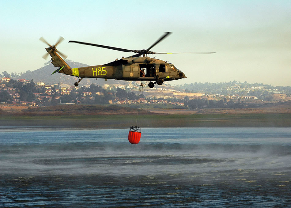SAN DIEGO (Oct. 23, 2007) - Chief Aviation Electronics Technician Rexford Sackett, assigned to Helicopter Sea Combat Squadron (HSC) 85, looks upon miles of burnt terrain as he and other Sailors prepare to help fend off the blaze aboard an MH-60S Seahawk. HSC-85 is providing helicopters specially equipped with a 420-gallon extinguishing trough used to dump water on San Diego's ongoing fire disaster. The blaze has already forced more than 250,000 people from their homes. U.S. Navy photo by Mass Communication Specialist 2nd Class Chris Fahey