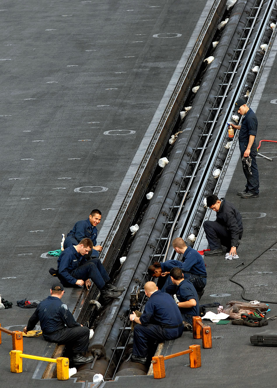 PACIFIC OCEAN (Nov. 17, 2007) Sailors aboard the Nimitz-class nuclear-powered aircraft carrier USS Abraham Lincoln (CVN 72) begin cleaning one of Lincoln's four catapults on the flight deck. Lincoln is off the coast of Southern California. U.S. Navy photo by Mass Communication Specialist 3rd Class Geoffrey Lewis