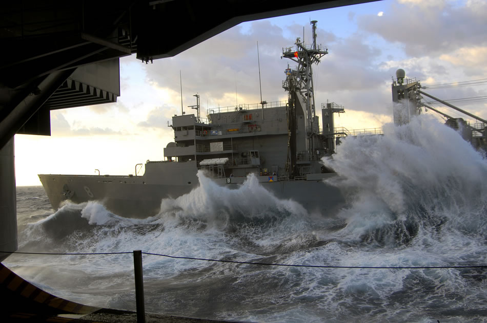 ATLANTIC OCEAN (Nov. 6, 2007) - Rough seas pound the hull of Military Sealift Command fast combat support ship USNS Arctic (T-AOE 8) as she sails alongside Nimitz-class aircraft carrier USS Harry S. Truman (CVN 75) while preparing for a replenishment at sea. Truman is a part of Carrier Strike Group (CSG) 10 and is en route to the Central Command area of responsibility as part of the ongoing rotation to support maritime security operations in the region. U.S. Navy photo by Mass Communication Specialist 3rd Class Joshua A. Moore