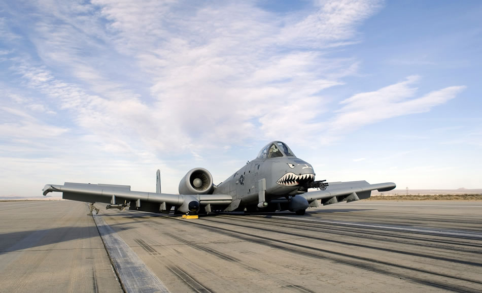 An A-10 sits on the runway after making an emergency landing March 25 at Edwards Air Force Base, Calif. The A-10 touched down with its landing gear in the up position after declaring an in-flight emergency. The pilot was not harmed. The aircraft, assigned to the 75th Fighter Squadron at Moody AFB, Ga., was participating in a Green Flag sortie out of Nellis AFB, Nev. (U.S. Air Force photo/Brad White)