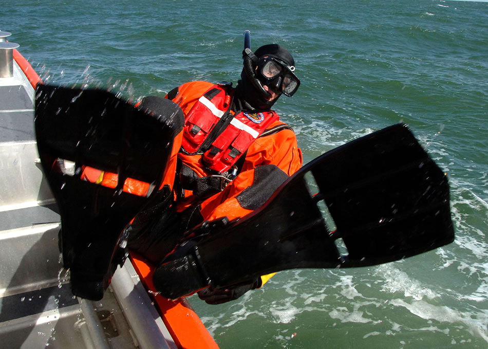 A U.S. Coast Guard aviation survival technician assigned to Coast Guard Air Station Elizabeth City, N.C., conducts a man overboard exercise from a new 45-foot response boat-medium off the coast of Virginia, April 16, 2008. Coast Guard Station Little Creek out of Virginia Beach, Va., is the first Coast Guard unit in the world to receive the new RB-M. U.S. Coast Guard photo by Petty Officer 2nd Class Christopher Evanson