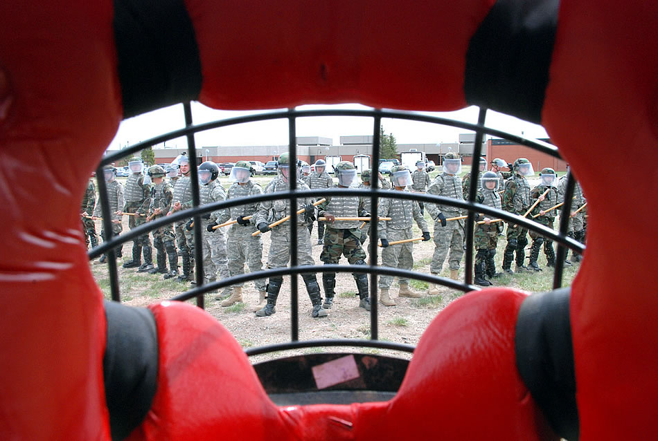 Security forces Airmen form a wedge during confrontation training April 28 at F.E. Warren Air Force Base, Wyo. As seen through the camera, the "aggressors" are dressed in protective red suits so that they can provide the Airmen a realistic situation for crowd control. (U.S. Air Force photo/Staff Sgt. Chad Thompson)
