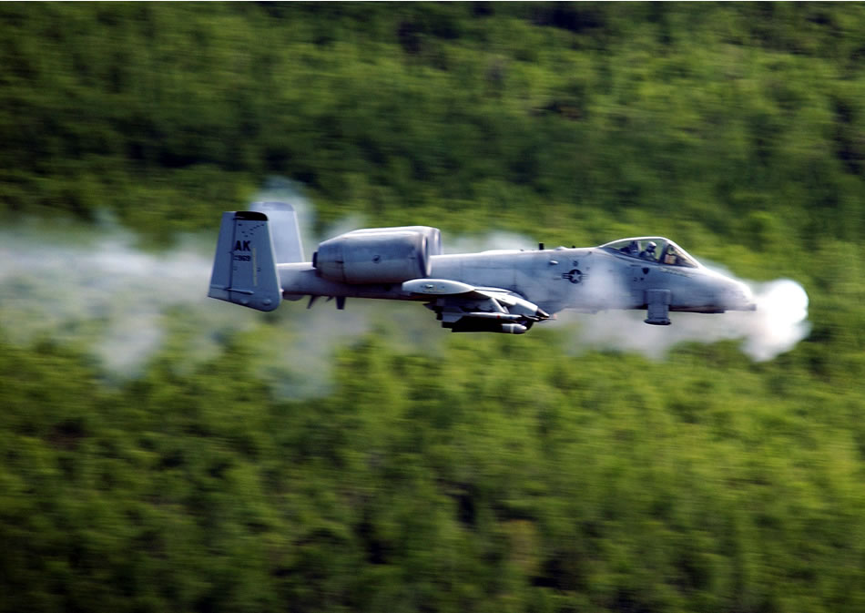An A-10 Thunderbolt II from the 355th Fighter Squadron at Eielson Air Force Base, Alaska, fires a 30mm GAU-8 Avenger seven-barrel Gatling gun over the Pacific Alaska Range Complex. (U.S. Air Force photo/Airman 1st Class Jonathan Snyder)