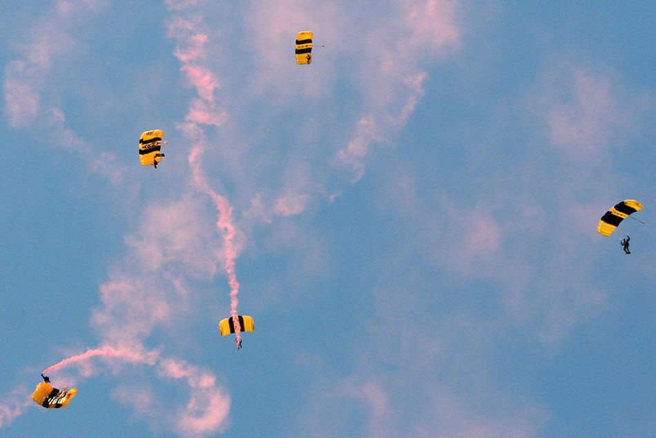 Members of the U.S. Army Parachute Team, the Golden Knights, perform aerial maneuvers above the flight line during the Armed Forces Day Joint Service Open House, May 17, 2008, at Andrews Air Force Base, Md. U.S. Army photo by Sgt. Jennifer Sheldon