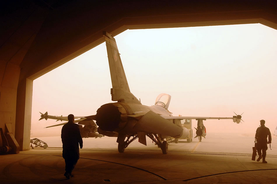 Crew chiefs assigned to the 332nd Expeditionary Aircraft Maintenance Squadron spot an F-16 Fighting Falcon while being pushed into a hardened aircraft shelter during a major dust storm May 9 at Joint Base Balad, Iraq. Protecting flightline assets from dust damage or destruction is important to maintaining the air mission. (U.S. Air Force photo/Senior Airman Julianne Showalter)