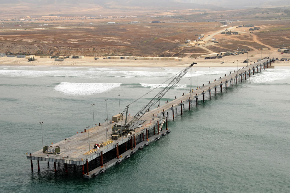 CAMP PENDLETON, Calif. (July 22, 2008) An elevated causeway system (ELCAS) is at Red Beach with Camp Peguero in the distance during Joint Logistics Over-The-Shore (JLOTS) 2008. JLOTS 2008 is an engineering, logistical training exercise between Army and Navy units under a joint force commander as a means to load and unload ships without the benefit of deep draft-capable, fixed port facilities. U.S. Navy photo by Mass Communication Specialist 2nd Class Brian P. Caracci)