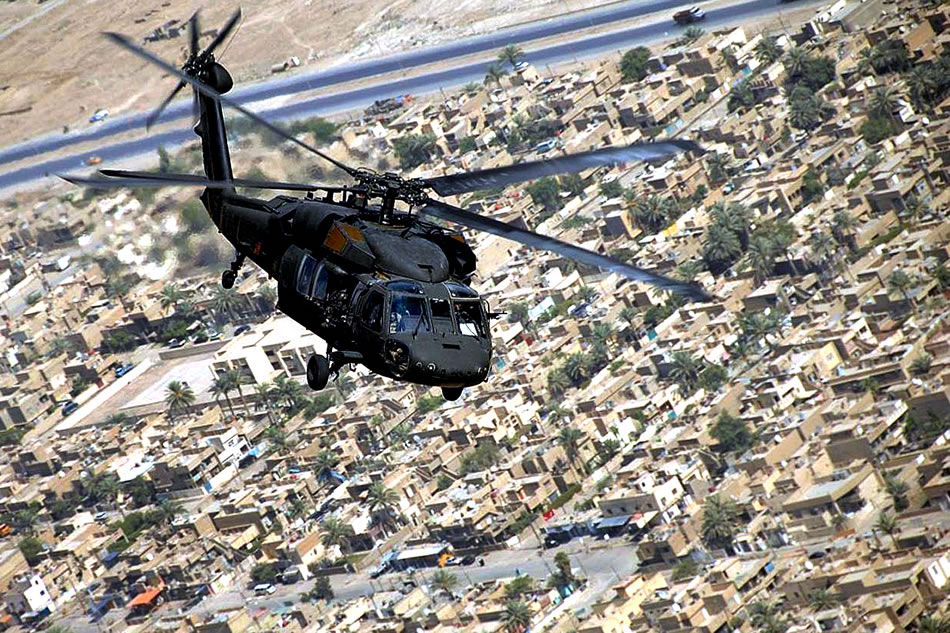 A U.S. Army UH-60 Blackhawk helicopter flies over eastern Baghdad as the command staff of the 10th Mountain Division conducts an aerial reconnaissance of major joint security stations and combat outposts in Baghdad, Iraq, July 25, 2008. U.S. Army photo by Staff Sgt. Brian D. Lehnhardt