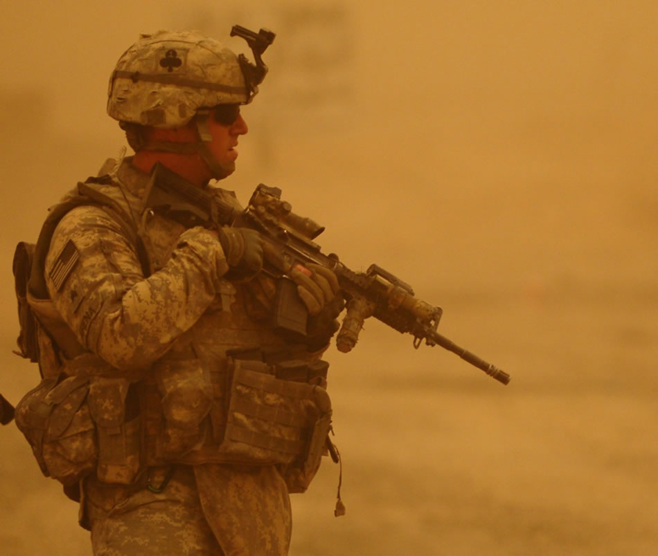 A Coldsteel Soldier with 1st Battalion, 327th Infantry Regiment, 1st Brigade Combat Team, 101st Airborne Division, patrols an area near Balad, Iraq during a severe sandstorm. The Coldsteel element teamed up with Iraqi security forces during Operation Balls Pursuit to track down enemy fighters in the area. Photo by Sgt. Richard Rzepka 1st Brigade Combat Team, 101st Airborne Division (AA) Public Affairs