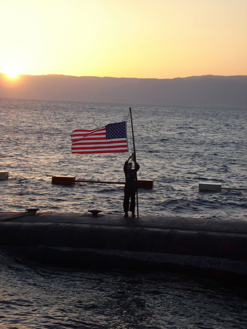 Area of Operation (Dec. 25, 2007) Sonar Technician Submarines 3rd Class Anthony Morandi observes evening colors on Christmas aboard the Los Angeles-class attack submarine USS Philadelphia (SSN 690) during a port visit in the Middle East. Philadelphia is on a regularly scheduled deployment as part of USS Enterprise Carrier Strike Group conducting Maritime Security Operations (MSO). MSO help set the conditions for security and stability in the maritime environment, as well as complement the counterterrorism and security efforts of regional nations. These operations seek to disrupt violent extremists use of the maritime environment as a venue for attack or to transport personnel, weapons or other material. U.S. Navy photo by Ensign James Heckman
