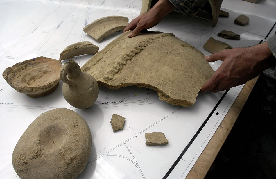 Second Lt. Brian Wernle looks over artifacts Dec. 26 found during construction at Kirkuk Air Base, Iraq. In the past month, artifacts have been found by civil engineering Airmen at four different sites. Lieutenant Wernle is the base environmental engineer with the 506th Expeditionary Civil Engineer Squadron. (U.S. Air Force photo/Staff Sgt. Brian Ferguson)