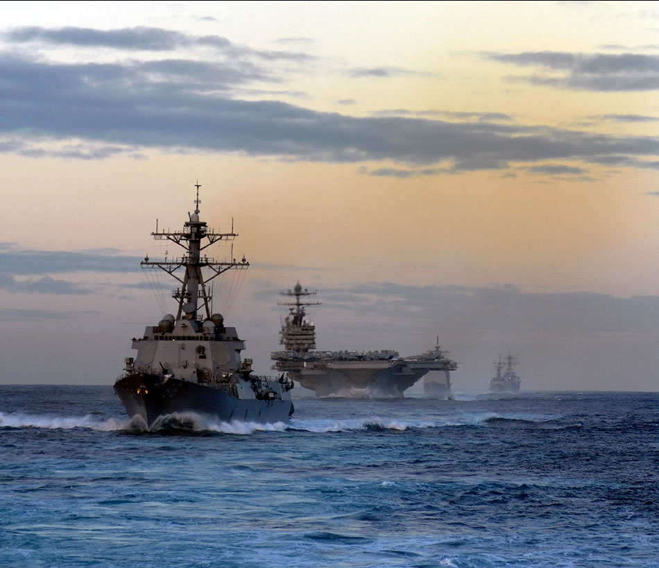 PACIFIC OCEAN (Jan. 26, 2008) Ships assigned to USS Abraham Lincoln Strike Group, led by the guided missile destroyer USS Momsen (DDG 92) during a straight transit exercise. Ships and aircraft assigned to Carrier Strike Group (CSG) 9 are underway off the coast of Southern California participating in a Joint Task Force Exercise. U.S. Navy photo by Mass Communication Specialist 2nd Class James R. Evans
