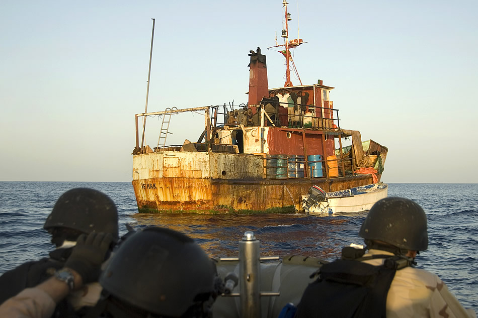 Members of a USS Gettysburg visit, board, search and seizure team and a U.S. Coast Guard law enforcement vessel approach a suspected pirate mothership after responding to a merchant vessel distress signal while operating in the Combined Maritime Forces area of responsibility as part of CombineTask Force 151 in the Gulf of Aden, May 13, 2009. Gettysburg, a guided-missile cruiser, is serving as the flagship of CTF 151, a multinational task force to conduct counter-piracy operations. U.S. Navy photo by Petty Officer 1st Class Eric L. Beauregard