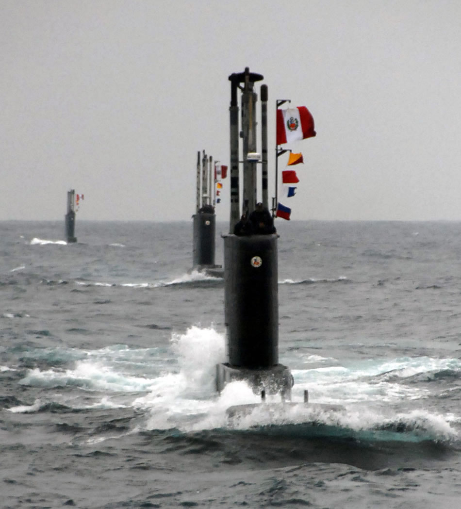 EASTERN PACIFIC (June 17, 2009) The Peruvian submarines BAP Pisagua (SS-33), BAP Chipana (SS-34), and BAP Islay (SS-35) ride on the surface in a column during 2009 Peruvian PASSEX. For several days the units conducted integrated anit-submarine warfare excercises off the coast of Lima, Peru. (U.S. Navy photo by Lt. Chris Brown/Released)