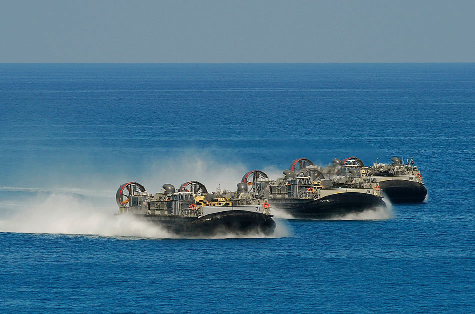 Three landing craft air cushion vehicles assigned to Assault Craft Unit 4 approach the shore after launching from the multi-purpose amphibious assault ship USS Bataan during Bright Star 2009. The biennial, multinational exercise is conducted by U.S. Central Command and involves U.S., Egyptian and other coalition forces. Photo by Petty Officer 2nd Class Kristopher Wilson