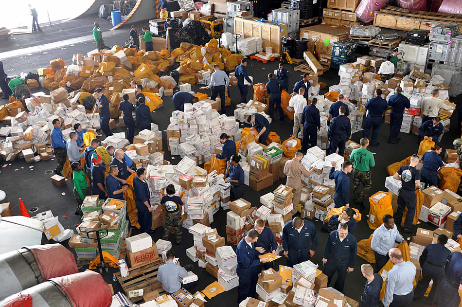 ARABIAN SEA (Dec. 24, 2009) Sailors aboard the aircraft carrier USS Nimitz (CVN 68) sort through 34,400 pounds of mail delivered Christmas Eve. The Nimitz Carrier Strike Group is on a routine deployment to the region. Operations in the U.S. 5th Fleet area of operations are focused on reassuring regional partners of the United States commitment to security, which promotes stability and global prosperity. (U.S. Navy photo by Mass Communication Specialist 1st Class David Mercil)