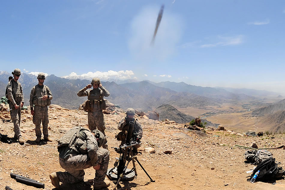 U.S. Army soldiers fire a round from the 60mm mortar launcher during training at Outpost Loyalty, Nangarech, Afghanistan, May 15, 2010. The soldiers are assigned to 4th Infantry Division's Company D, 1-102nd Infantry Regiment, Task Force Mountain Warrior. U.S. Air Force photo by Staff Sgt. Steven Doty