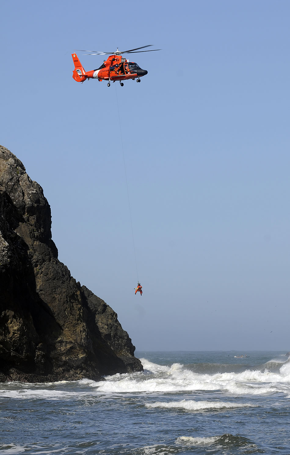MCKINLEYVILLE, Calif. Coast Guard Petty Officer 3rd Class Brandon Dent, an aviation survival technician stationed at Air Station Humboldt Bay, lowers from an MH-65C Dolphin helicopter to rescue a kayaker stranded on the Trinidad Head rocks, July 4, 2010. The Coast Guard helicopter crew rescued the kayaker after he overturned in the surf and swam to the rocks. U.S. Coast Guard photo by Lt. Todd Vorencamp