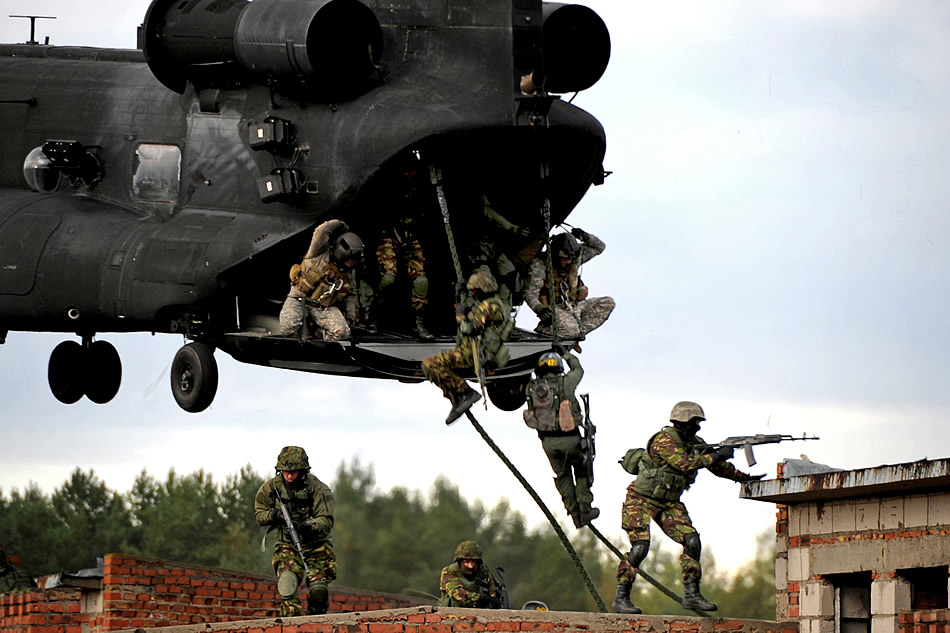 Ukranian Special Forces exit a U.S. Army MH-47G Chinook helicopter during a rehearsal for the opening exercise of Jackal Stone 10 in Poland, Sept. 19, 2010. Jackal Stone 10, hosted by Poland and Lithuania, is an annual international special operations forces exercise held in Europe and coordinated with U.S. Special Operations Command Europe. U.S. Army photo by Sgt. 1st Class Jason Cauley