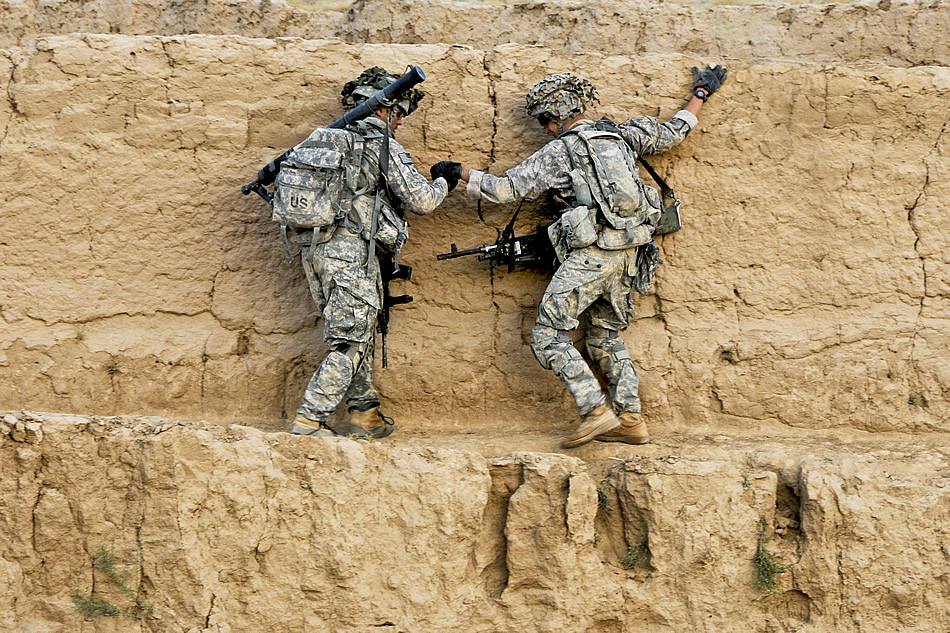 U.S. Army Sgt. Sharanjit Dhaliwal helps one of his soldiers across a narrow path during a presence patrol in Zabul province, Afghanistan, Sept. 18, 2010. Dhaliwal is assigned to the 1st Battalion, 4th Infantry Regiment. U.S. Army photo by Spc. Joshua Grenier
