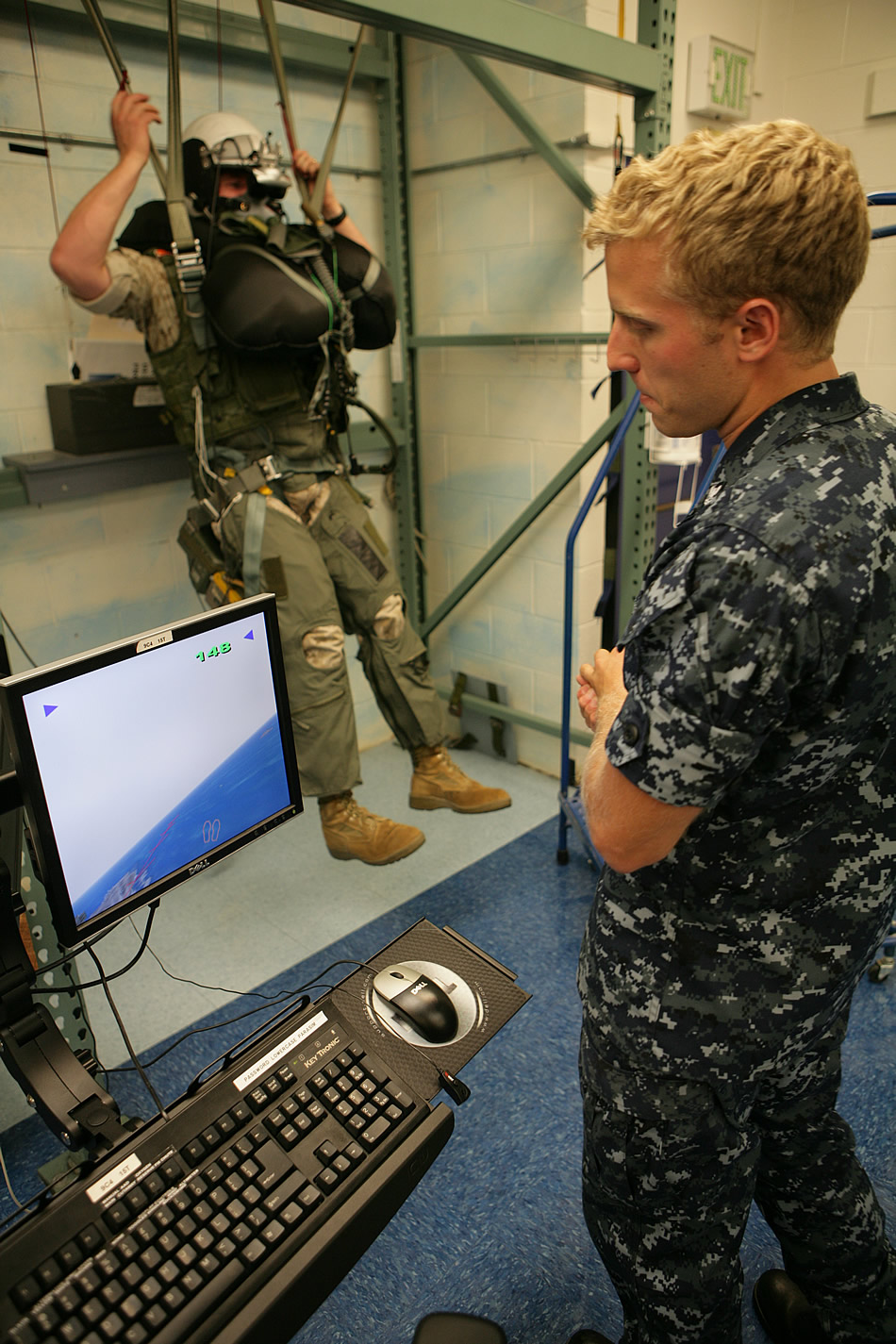MIRAMAR, Calif. (Sept. 20, 2010) A Marine assigned to Marine Aviation Weapons and Tactics Squadron (TECOM) 1, performs a virtual parachute landing while a Sailor operates the Virtual Parachute Trainer during flight physiology training at the Aviation Survival Training Center at Marine Corps Air Station Miramar. (U.S. Marine Corps photo by Cpl. Patrick P. Evenson)