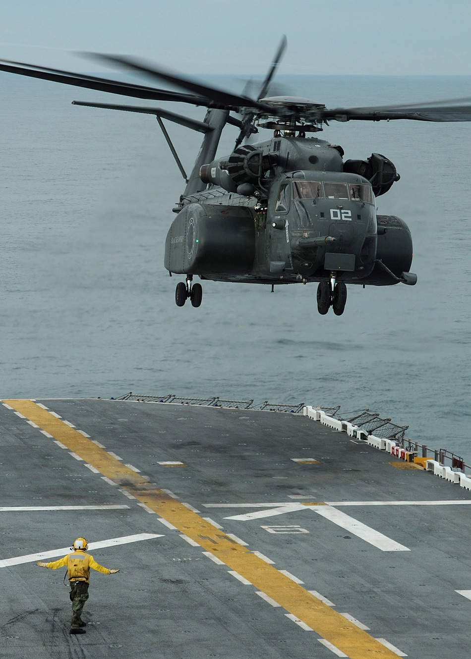 ATLANTIC OCEAN (April 13, 2011) An MH-53E Sea Dragon helicopter assigned to the Blackhawks of Helicopter Mine Countermeasure Squadron (HM) 15 prepares to land aboard the multi-purpose amphibious assault ship USS Iwo Jima (LHD 7). Iwo Jima is underway in preparation for the unit level training assessment sustainment. (U.S. Navy photo by Mass Communication Specialist 2nd Class Zane Ecklund)