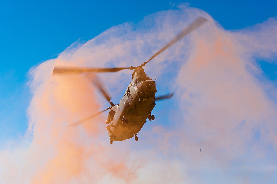 A Royal Air Force CH-47 Chinook flies through smoke as it prepares to land at Patrolling Base Jeker in Nahr-e Saraj district, Helmand province, Sept. 13. Regional Command SouthwestPhoto by Petty Officer 2nd Class Jonathan Chandler