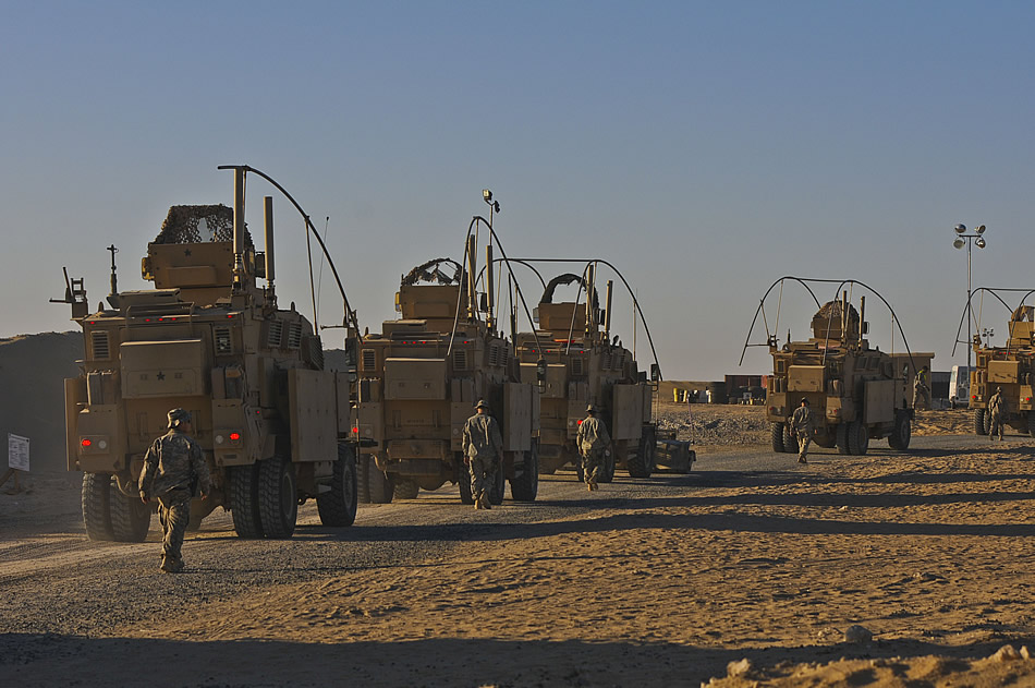 Soldiers ground guide tactical vehicles into the Four Corners yard here Dec. 6. After the long journey from Iraq, the vehicles and equipment will go to the Redistribution Property Assistance Team yard to be staged for redeployment back to the U.S. Third Army is shaping the future by meeting the security agreement while building and maintaining multinational partnerships throughout the region. Photo by Staff Sgt. Lynette Hoke