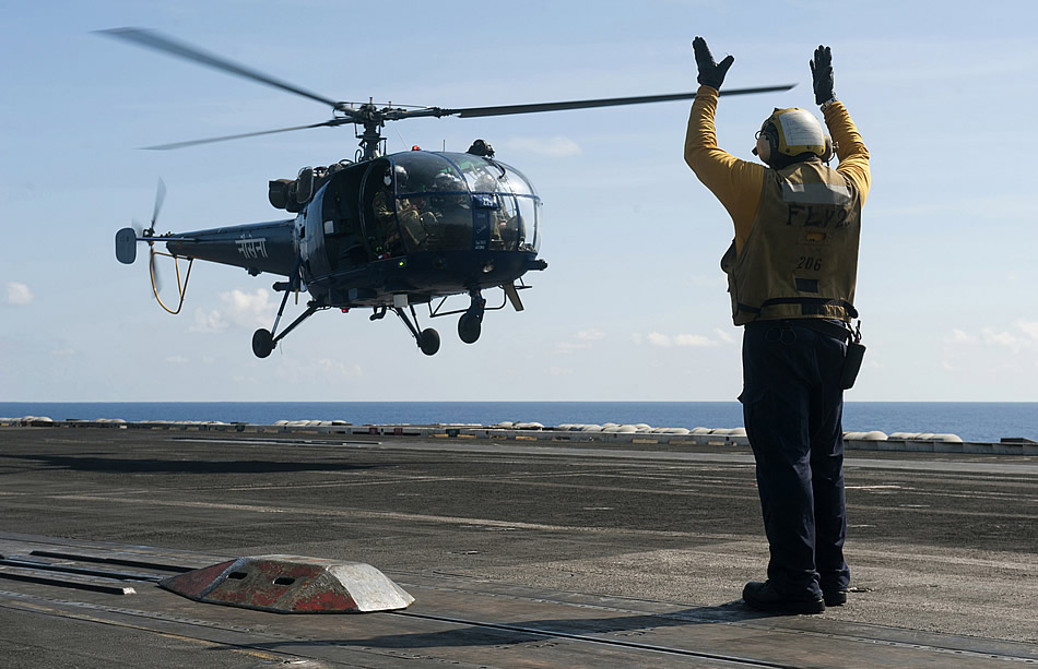 INDIAN OCEAN (April 11, 2012) Aviation Boatswain's Mate (Handling) 2nd Class Dwayne Foster signals as an Indian navy HAL Chetak (Alouette III) helicopter launches from the flight deck aboard the Nimitz-class aircraft carrier USS Carl Vinson (CVN 70). Carl Vinson and Carrier Air Wing (CVW) 17 are deployed participating in the Malabar Exercise with ships and aircraft from the Indian navy. (U.S. Navy photo by Mass Communication Specialist 2nd Class James R. Evans)
