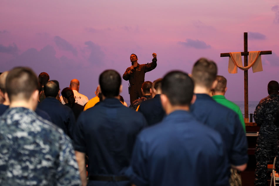 ARABIAN SEA (March 31, 2013)Sailors aboard the aircraft carrier USS John C. Stennis (CVN 74) hold an Easter sunrise service. John C. Stennis is deployed to the U.S. 5th Fleet area of responsibility conducting maritime security operations, theater security cooperation efforts and support missions for Operation Enduring Freedom. U.S. Navy photo by Mass Communication Specialist Seaman Marco Villasana