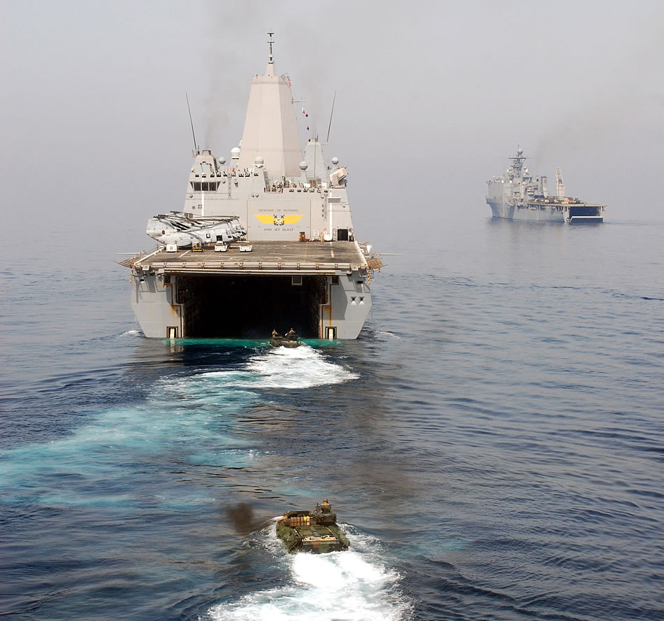 U.S. 5TH FLEET AREA OF RESPONSIBILITY (March. 29, 2013) Amphibious assault vehicles approach the amphibious transport dock ship USS Green Bay (LPD 20) during an exercise with the amphibious dock landing ship USS Rushmore (LSD 47). is part of the Peleliu Amphibious Ready Group and, with embarked elements of the 15th Marine Expeditionary Unit (15 MEU), is deployed in support of maritime security operations and theater security cooperation efforts in the U.S. 5th Fleet area of responsibility. (U.S. Navy photo by Mass Communication Specialist 1st Class Elizabeth Merriam)