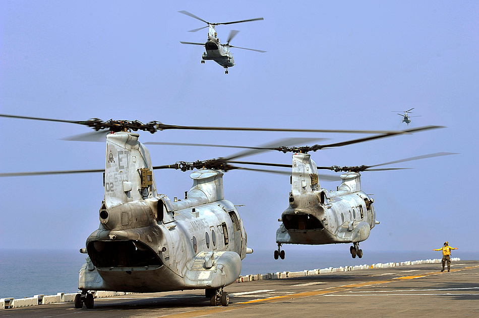 GULF OF THAILAND (Feb. 14, 2013) CH-46E Sea Knight helicopters assigned to Marine Medium Helicopter Squadron (HMM) 262 take off from the amphibious assault ship USS Bonhomme Richard (LHD 6). The Bonhomme Richard Amphibious Ready Group, on deployment in the U.S. 7th Fleet area of responsibility, is taking part in Cobra Gold 2013, a Thai-U.S. co-sponsored multinational joint exercise. (U.S. Navy photo by Mass Communication Specialist 2nd Class Adam M. Bennett)
