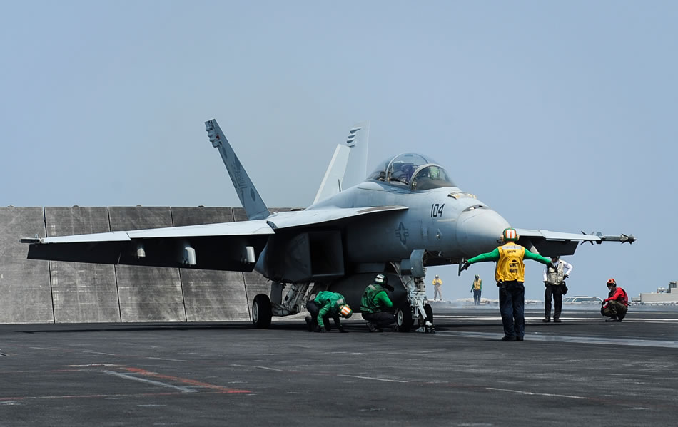 ARABIAN GULF (Aug. 21, 2015) Sailors prepare an F/A-18F Super Hornet assigned to the Red Rippers of Strike Fighter Squadron (VFA) 11 for launch during flight operations aboard the aircraft carrier USS Theodore Roosevelt (CVN 71). Theodore Roosevelt is deployed in the U.S. 5th Fleet area of operations supporting Operation Inherent Resolve, strike operations in Iraq and Syria as directed, maritime security operations and theater security cooperation efforts in the region. (U.S. Navy photo by Mass Communication Specialist 3rd Class Anna Van Nuys)