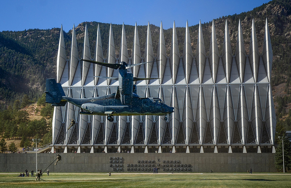 Aircrew with the 20th Special Operations Squadron and combat controllers with the 26th Special Tactics Squadron execute an aerial and ground demonstration for U.S. Air Force Academy cadets Nov. 10, 2015, in Colorado Springs, Colo. The flyover and demonstration celebrated Veterans Day with future leaders of the Air Force. (U.S. Air Force photo/Airman 1st Class Shelby Kay-Fantozzi)