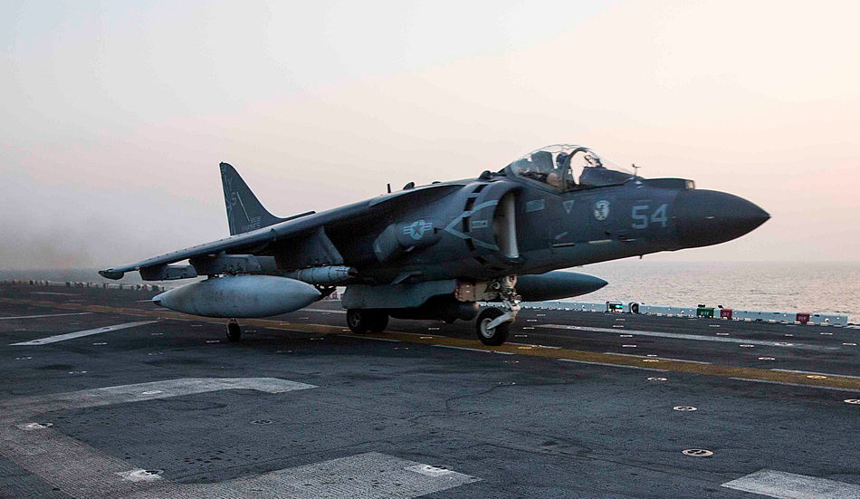ARABIAN GULF (Nov. 19, 2015) An AV-8B Harrier assigned to Marine Medium Tiltrotor Squadron (VMM) 162 (Reinforced), 26th Marine Expeditionary Unit (26th MEU), launches from the amphibious assault ship USS Kearsarge (LHD 3) to conduct their first missions over Iraq in support of Operation Inherent Resolve. Kearsarge is deployed to the U.S. 5th Fleet, supporting Operation Inherent Resolve, the effort to degrade and ultimately destroy ISIL; maritime security operations; and regional theater security cooperation efforts. (U.S. Navy photo by Mass Communication Specialist Seaman Apprentice Ryre Arciaga)