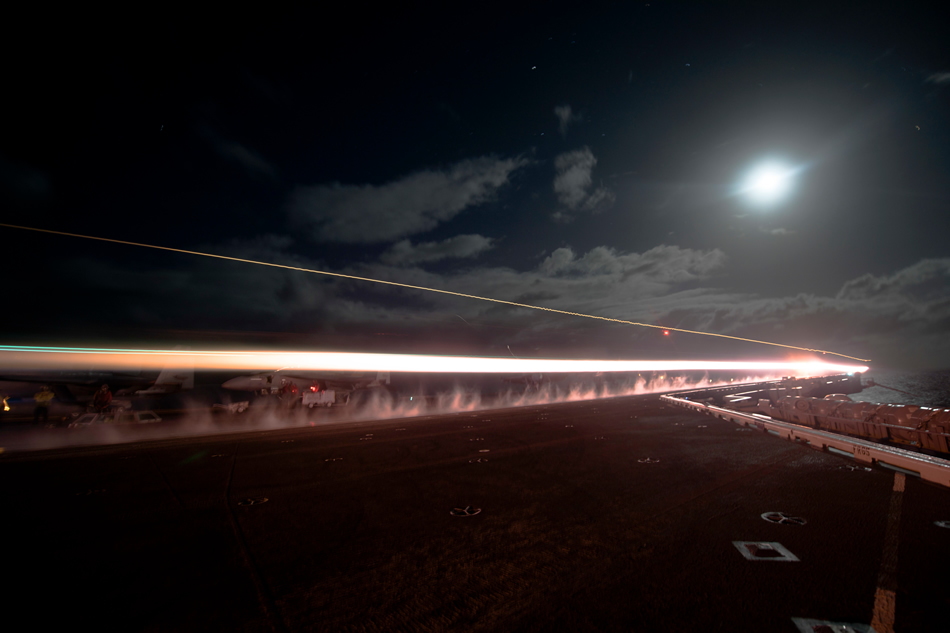 ATLANTIC OCEAN (Nov. 27, 2015) An F/A-18C Hornet assigned to the Wildcats of Strike Fighter Squadron (VFA) 131 takes off from the flight deck of the aircraft carrier USS Dwight D. Eisenhower (CVN 69). Dwight D. Eisenhower is currently underway with embarked Carrier Air Wing 3 conducting the Tailored Ship's Training Availability (TSTA) and Final Evaluation Problem (FEP) phase of their pre-deployment schedule. (U.S. Navy photo by Mass Communication Specialist 3rd Class J. Alexander Delgado)