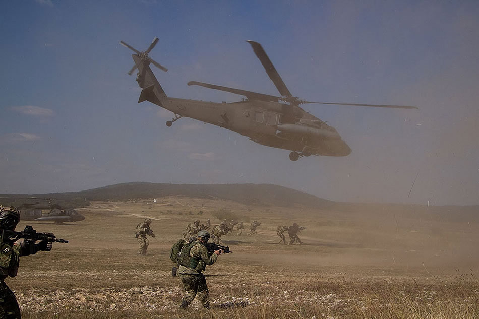 Army Special Forces and their NATO allied counterparts conduct an air assault on a small compound, Sept. 27, 2016, during Brave Warrior 2016/Black Swan at Bakony Combat Training Center, Hungary. The 3rd Battalion, 501st Aviation Regiment, 1st Armored Division, Combat Aviation Brigade, provided UH-60 Black Hawk support for the training mission. The exercise brings nations together to enhance interoperability and strengthen allied relationships. (Photo by Staff Sgt. Jennifer Bunn)