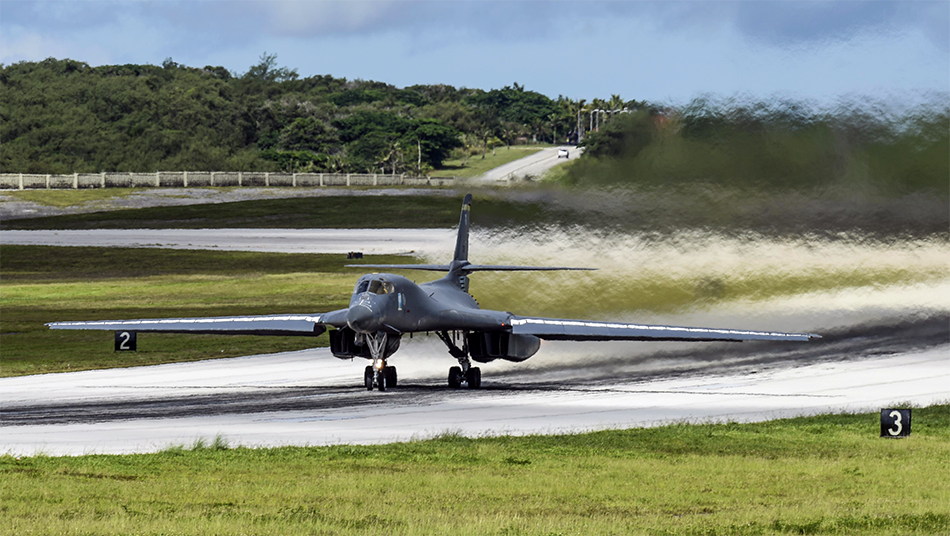 A U.S. Air Force B-1B Lancer assigned to the 37th Expeditionary Bomb Squadron, deployed from Ellsworth Air Force Base, South Dakota, takes off from Andersen Air Force Base, Guam, for a 10-hour mission, flying in the vicinity of Kyushu, Japan, the East China Sea, and the Korean peninsula, Aug. 7, 2017 (HST). During the mission, two B-1s were joined by Japan Air Self-Defense Force F-15s as well as Republic of Korea Air Force KF-16 fighter jets, performing two sequential bilateral missions. These flights with Japan and the Republic of Korea (ROK) demonstrate solidarity between Japan, ROK and the U.S. to defend against provocative and destabilizing actions in the Pacific theater. (U.S. Air Force photo/Tech. Sgt. Richard P. Ebensberger)