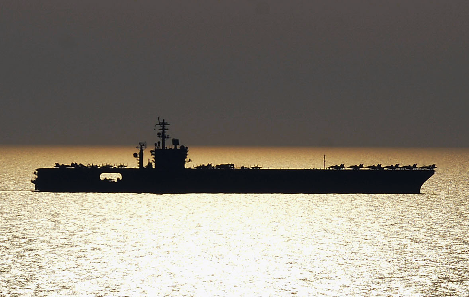 ARABIAN GULF (Oct. 17, 2017) The aircraft carrier USS Nimitz (CVN 68) transits the Arabian Gulf, Oct 17, 2017. Nimitz is deployed in the U.S. 5th Fleet area of operations in support of Operation Inherent Resolve. While in this region, the ship and strike group are conducting maritime security operations to reassure allies and partners, preserve freedom of navigation, and maintain the free flow of commerce. (U.S. Navy photo by Mass Communication Specialist Seaman David Claypool)