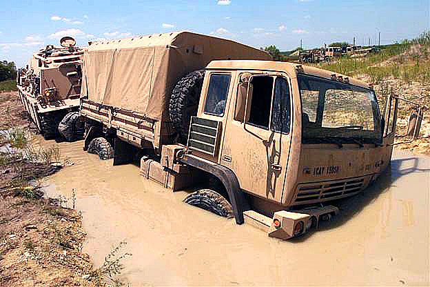 U.S. Army soldiers use a Hercules armored vehicle, in rear, to pull out another vehicle from a deep mud puddle during recover training on Fort Hood, Texas, Aug. 14, 2008. U.S. Army photo by Sgt. 1st Class Kap Kim