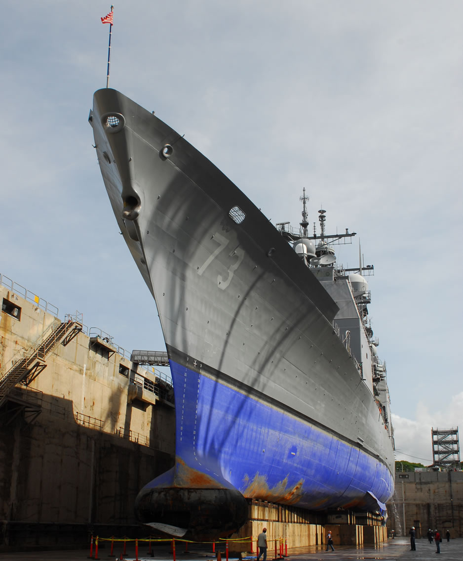 PEARL HARBOR (Feb. 19, 2009) The guided-missile cruiser USS Port Royal (CG 73) sits in drydock at the Pearl Harbor Naval Shipyard as it is readied for repairs following the Feb. 5 grounding about a half-mile south of Honolulu Airport. An assessment of the ship and the repair efforts needed are ongoing. The ship entered drydock Feb. 18. U.S. Navy photo by Michael F. Laley