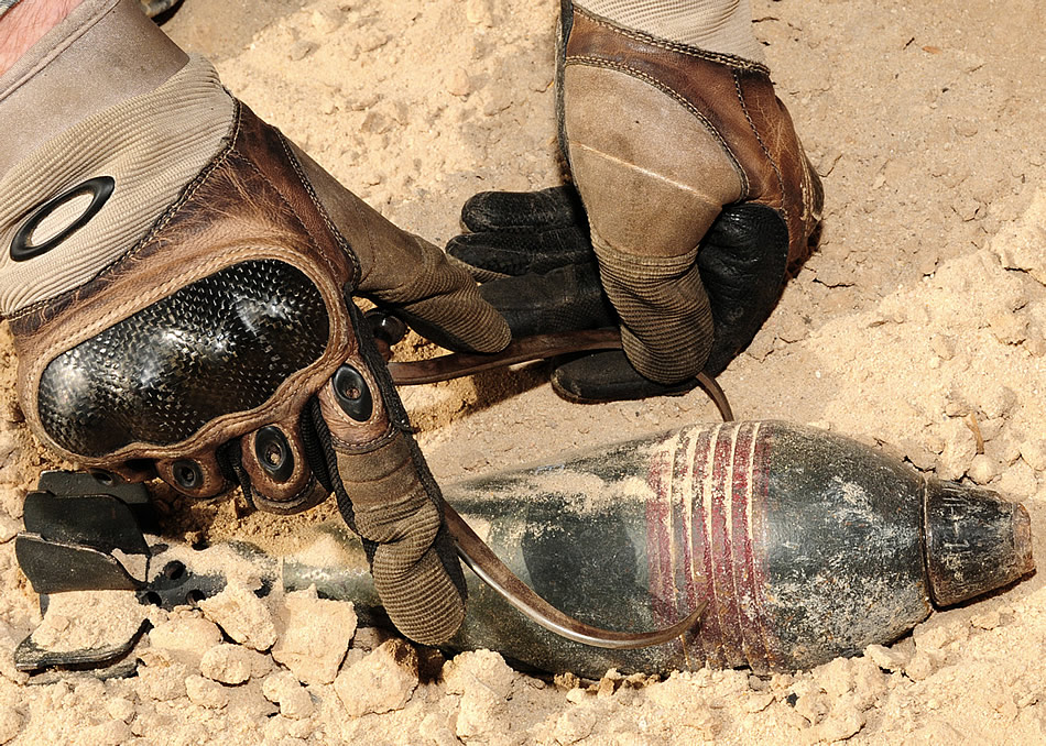 An Airman measures simulated unexploded ordnance with a caliper during training May 27 at an air base in Southwest Asia. Once the measurement it taken it is checked against a UXO reference book for identification. (U.S. Air Force photo/Senior Airman Courtney Richardson)