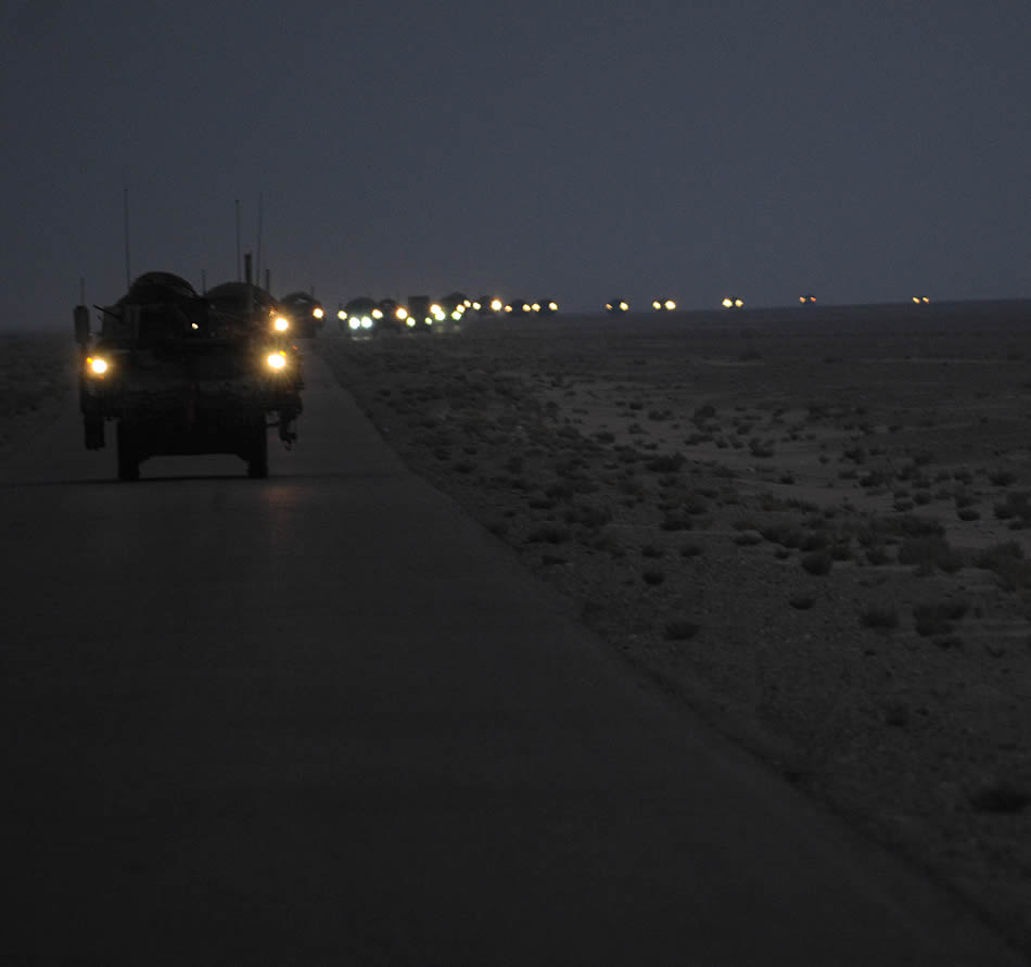 A line of Strykers convoy in the early hours of Aug. 16, as part of the 4th Stryker Brigade Combat Team, 2nd Infantry Division, United States Division-Centers last patrol through Iraq as they leave theater. The 4th SBCT is the last combat brigade to leave theater. Photo by Sgt. Kimberly Johnson