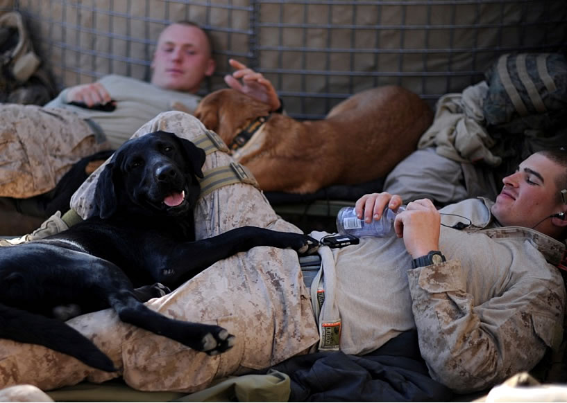 Above, U.S. Marines attached to 1st Battalion, 6th regiment, Charlie Company relax w/their bomb-sniffing dogs Books & Good One in Huskers camp on the outskirts of Marjah in central Helmand on 1/25/2010.