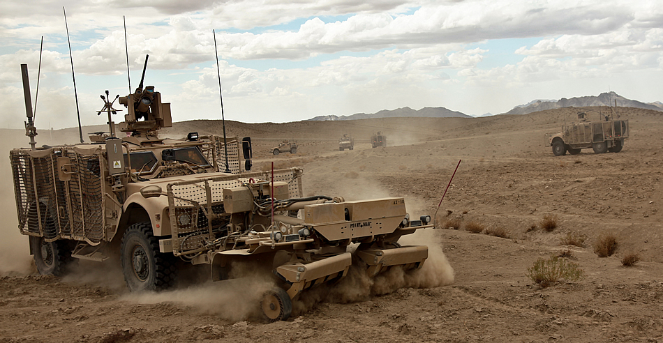 A U.S. Army mine resistant ambush protected all terrain vehicle with a mine-roller attached to the front pulls security in Wanake Valley, Kandahar province, Afghanistan, Sept. 3, 2011. The M-ATV is used for route clearing on convoys. (Photo by: Spc. Kristina Truluck, 55th Signal Company)