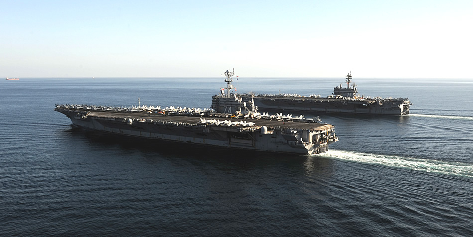 STRAIT OF HORMUZ (Nov. 12, 2011) The Nimitz-class aircraft carriers USS John C. Stennis (CVN 74) and USS George H. W. Bush (CVN 77) steam alongside one another in the Strait of Hormuz. John C. Stennis is deployed to the U.S. 5th Fleet area of responsibility conducting maritime security operations and support missions as part of Operation Enduring Freedom and New Dawn. (U.S. Navy photo by Mass Communication Specialist 3rd Class Kenneth Abbate)
