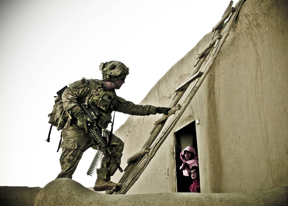 Spc. Thomas White, infantryman, Able Company, 1st Battalion, 2nd Infantry Regiment, 172nd Infantry Brigade, climbs a ladder to set up a defensive watch position during an air assault mission in Ghazni province, Afghanistan, March 21 while to Afghan children watch. The soldiers, alongside the Afghan National Army, searched two villages for insurgent activity and weapons caches.Photo by Spc. Robert Holland