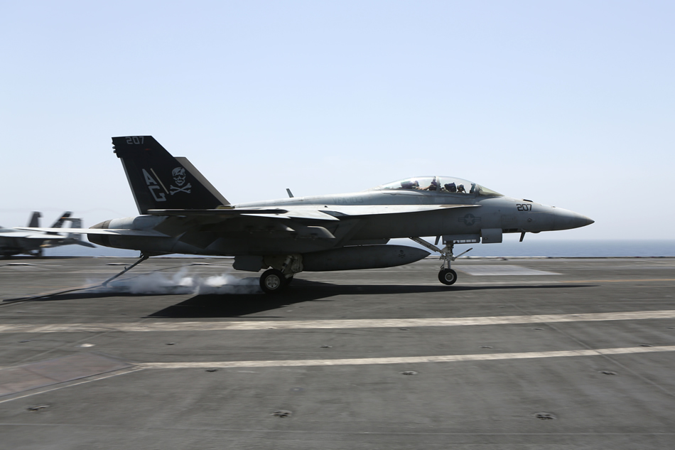 NORTH ARABIAN SEA (May 8, 2013) An F/A-18F Super Hornet assigned to the Jolly Rogers of Strike Fighter Squadron (VFA) 103 performs an arrested recovery on the flight deck of the aircraft carrier USS Dwight D. Eisenhower (CVN 69). Dwight D. Eisenhower is deployed to the U.S. 5th Fleet area of responsibility promoting maritime security operations, theater security cooperation efforts and support missions as part of Operation Enduring Freedom. (U.S. Navy photo by Mass Communication Specialist 3rd Class Justin R. Wesley)