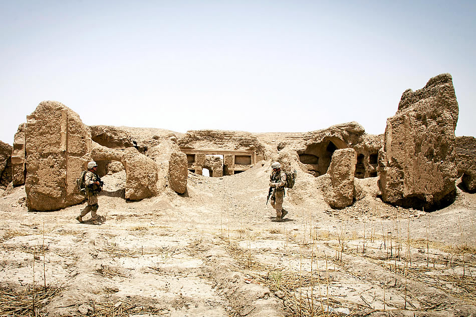 U.S. Navy Petty Officer 1st Class William Neason, left, and U.S. Marine Corps 1st Lt. Stephen T. Desmond, right, patrol through the ruins of a 200-year-old castle during Operation Northern Lion in Mohammad Abad village in Helmand province, Afghanistan, June 24, 2013. Neason, a hospital corpsman, and Desmond are assigned to Georgian Liaison Team-9. U.S. Marine Corps photo by Staff Sgt. Ezekiel R. Kitandwe
