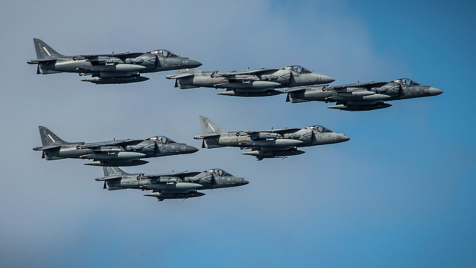 PACIFIC OCEAN (April 23, 2014) A group of AV-8B Harrier II's fly over the amphibious assault ship USS Boxer (LHD 4). Boxer, with the embarked 13th Marine Expeditionary Unit (13 MEU), is returning to homeport at San Diego from an eight-month deployment to the western Pacific and the U.S. Central Command areas of responsibility. (U.S. Navy photo by Mass Communication Specialist 2nd Class Kenan O'Connor)