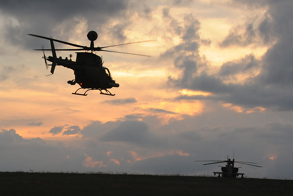 An OH-58D Kiowa, assigned to 1st Battalion, 17th Cavalry Squadron, 82nd Combat Aviation Brigade, flies off at dusk over an AH-64 Apache during Joint Readiness Center Rotation 16-02 at Fort Polk, La., Nov. 9, 2015. This is the Kiowas' last appearance at JRCT before the airframe is retired in 2016, and its mission is taken over by the Apache. (U.S. Army Photo by Capt. Joe Bush)